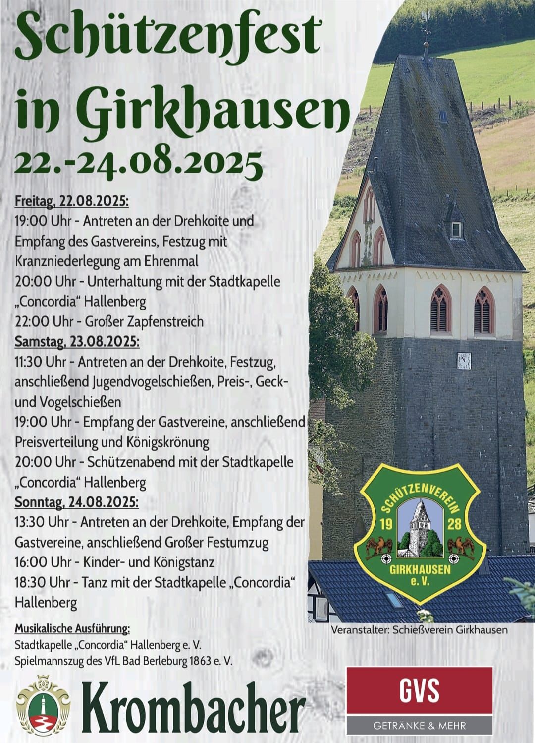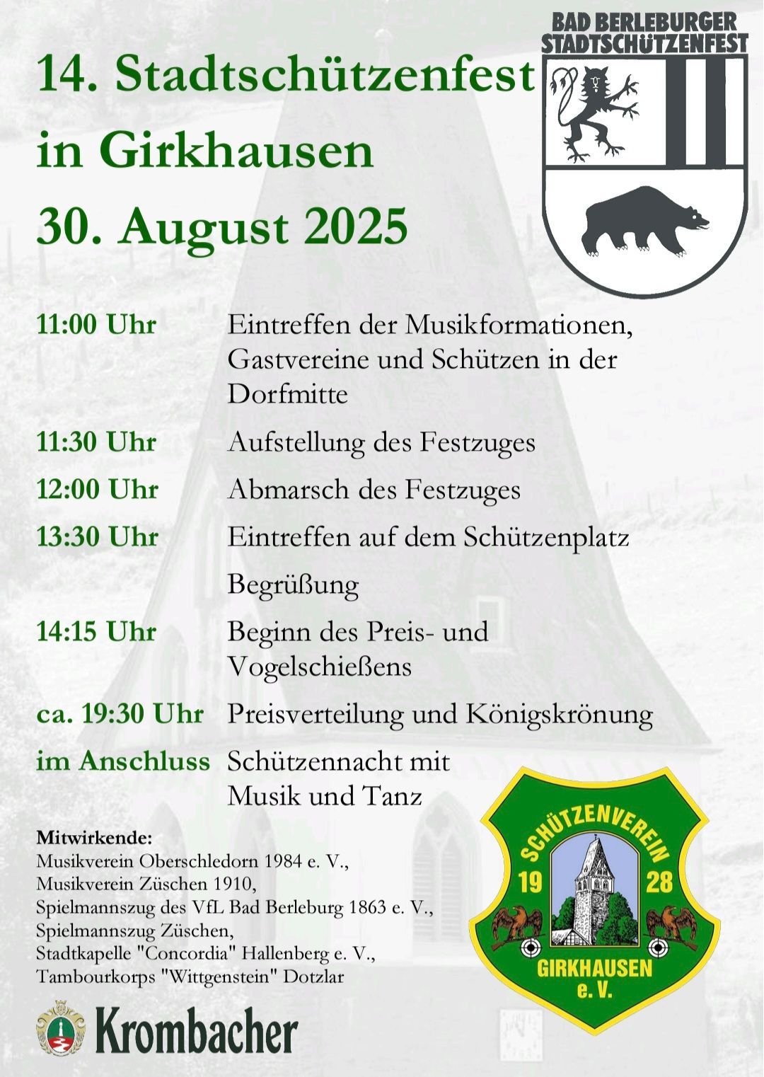 vom 22. bis 24. August 2025 feiern wir unser traditionelles Schützenfest in Girkhausen – ein Höhepunkt im Dorfleben, auf den wir uns alle das ganze Jahr freuen!